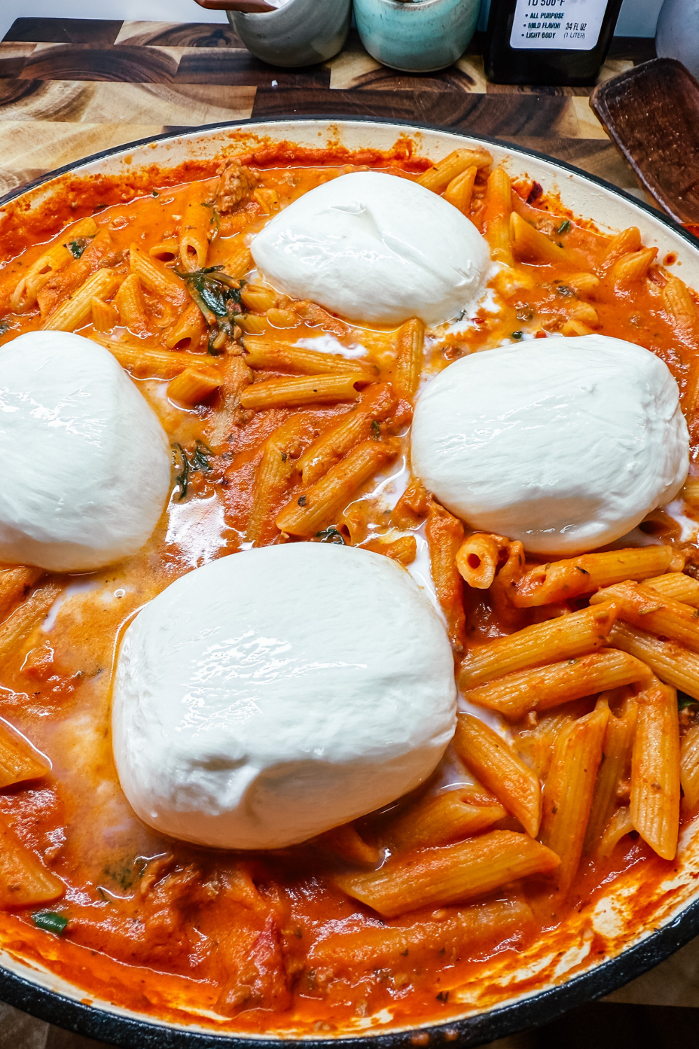 I love serving this family-style in a wide, shallow pot so everyone can dig in together. But it’s just as easy (and maybe a little fancier) to plate individual portions: a bed of pasta with half a burrata nestled on top, finished with fresh basil.