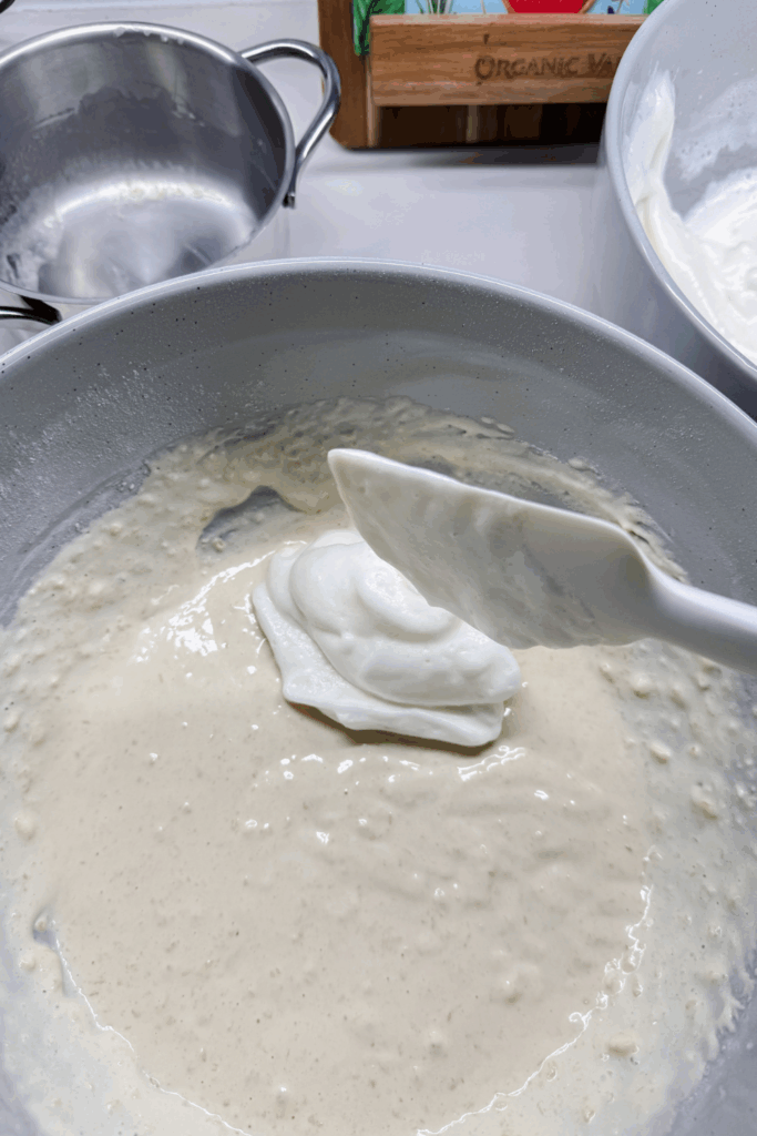 Fold and cook: Gently fold the egg whites into the batter a scoop at a time (about ½ cup per fold). Be gentle — we’re protecting all that airy goodness!